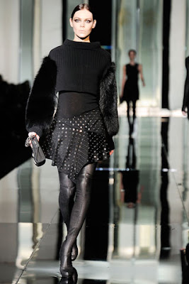 Her weapons of choice: grommeted and studded black-suede tank dresses and scarves, fur jackets, steel-heeled leather boots so high they disappear underneath her hems, body-conscious knits, and leggings that lace up the sides.