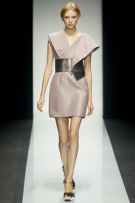 Draped dresses, blouses, and jackets gave the impression that they'd slip right off with one quick tug of the giant leather obi belts that cinched them. Skirts also flashed skin; one slit was so high it required shorts underneath.